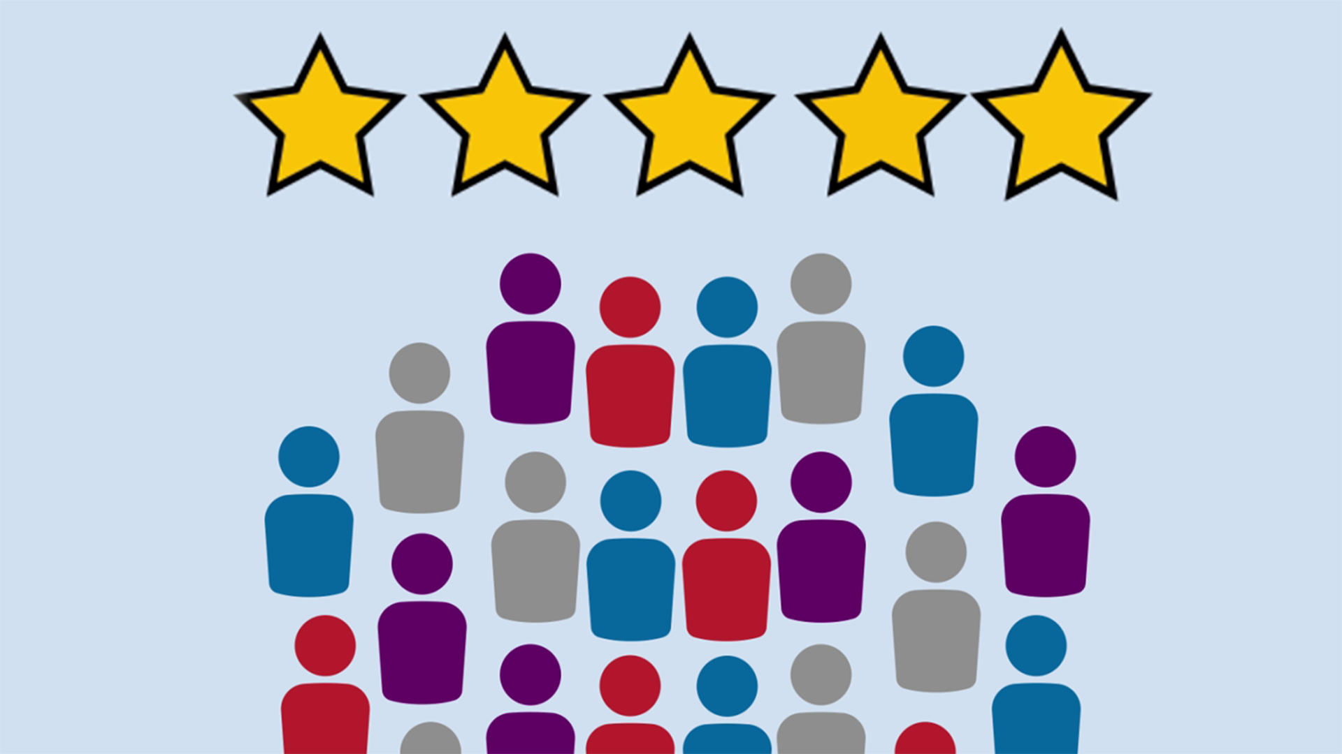 The people increase in numbers as the process icons are removed. A 5 star rating appears above the people to get all 5 stars filled. The people transition into a globe with a heart in the middle.